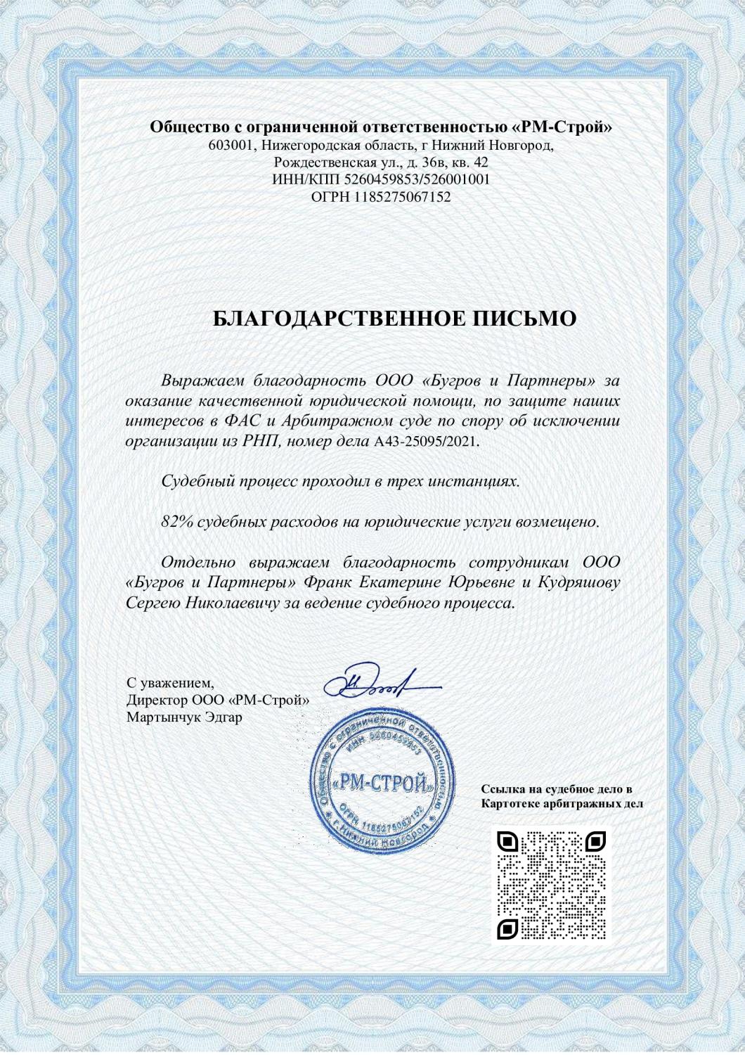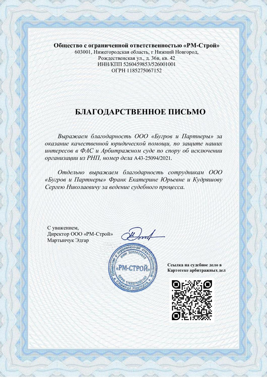 Благодарственное письмо от ООО "РМ-Строй"