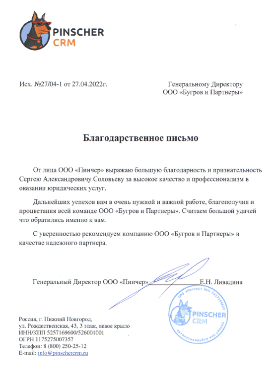 Благодарственное письмо от ООО "Пинчер"